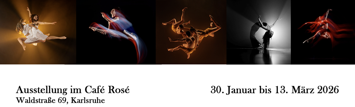 In der Ausstellung Im Licht 2026 ist eine Auswahl meiner Tanzfotografien im Café Rosé in Karlsruhe zu sehen, das von der Tänzerin Heidi Bouche und dem Maler Marvin Meyer gemeinsam betrieben wird.